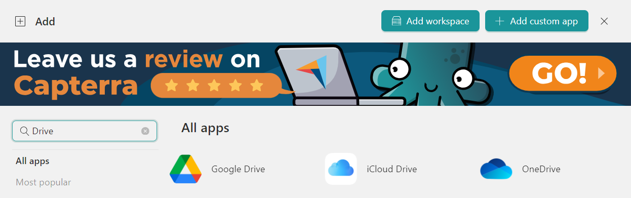 - Klicken Sie auf„+ Eine App oder einen Arbeitsbereich hinzufügen“Schaltfläche im Hauptfenster.