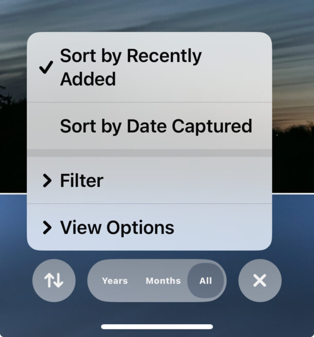 - Scrollen Sie nun ganz nach unten in der Kamerarolle Ihrer Fotos und tippen Sie auf die Pfeile, die in die entgegengesetzte Richtung zeigen (noch ein Rätsel-Button!) und tippen Sie auf „Sortieren nach „Zuletzt hinzugefügt““