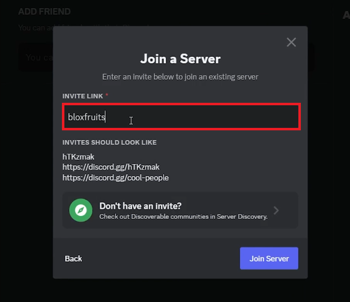 Blox Fruits Server finden:Wählen Sie im angezeigten Dialogfeld „Einem Server beitreten“ aus. Geben Sie dann „bloxfruits“ in das Feld „Einladungslink“ ein.