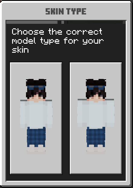 Ihr Datei-Explorer wird angezeigt, sodass Sie den benutzerdefinierten Minecraft-Skin finden können, den Sie zuvor heruntergeladen haben. Wählen Sie den passenden Modelltyp für Ihren Skin aus und importieren Sie ihn.