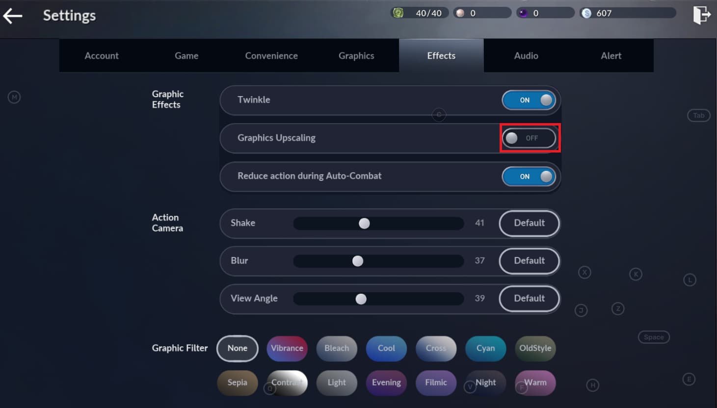 Wie kann ich die In-Game-Effekte für Black Desert Mobile auf BlueStacks verbessern?Deaktivieren Sie im Abschnitt „Effekte“ der Spieleinstellungen die Grafikhochskalierung auf Low-End-Systemen und erwägen Sie, die Optionen „Verwackeln“, „Unschärfe“ und „Blickwinkel“ zu verringern, um ein flüssigeres Spielerlebnis zu erzielen.