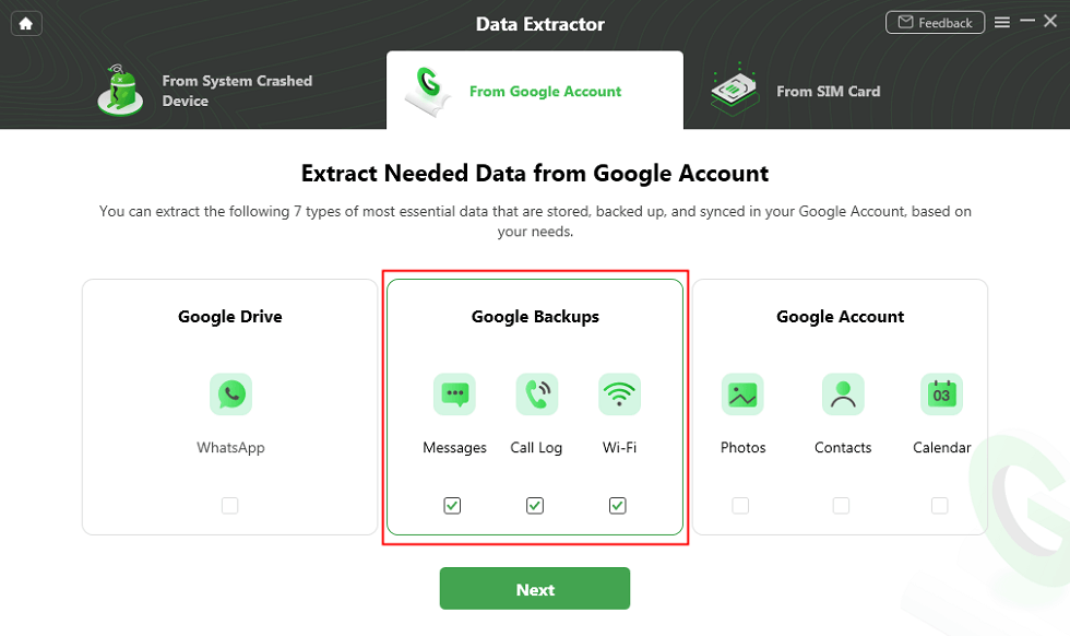 Schritt 1. Laden Sie DroidKit herunter und starten Sie es > Gehe zuDatenExtraktorund klickenVom Google-Konto.