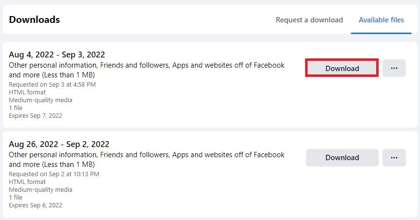 Es kann sein, dass Sie ein paar Sekunden warten müssen, bis dieser Download fertig ist, da er möglicherweise noch aussteht, wenn Sie eine große Datenmenge oder einen langen Zeitraum an Dateien herunterladen möchten. Wenn der Download fertig ist, erhalten Sie eine Benachrichtigung von Facebook und können dann nach Eingabe Ihres Kontopassworts den Download Ihrer Daten auswählen. Auf diese Weise können Sie gelöschte Nachrichten durchsuchen und finden.