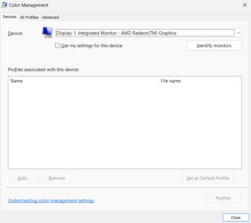 Sie können auch versuchen, das Farbprofil Ihres Displays zu ändern. Normalerweise wird das Standardfarbprofil Ihres Displays vom Hersteller konfiguriert. Windows kann Ihnen jedoch ein Standardfarbprofil zur Verfügung stellen, das die Verteilung der RGBs auf Ihrem Display verwaltet.