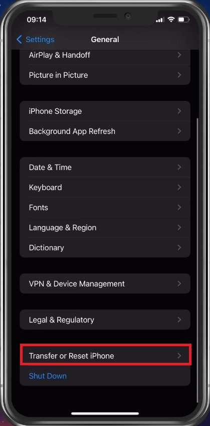 Wenn dies alles erledigt ist, haben Sie die Möglichkeit, beim Zurücksetzen Ihres Geräts ein Backup Ihres Geräts zu erstellen. Gehen Sie dazu zurück zu Ihren Haupteinstellungen und tippen Sie aufAllgemein. Als nächstes wählen Sie ausiPhone übertragen oder zurücksetzenUndLöschen Sie alle Inhalte und Einstellungen.