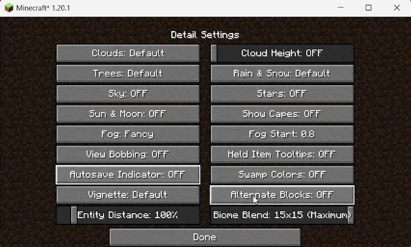 Deaktivieren Sie außerdem Emissive Textures, Better Snow und Natural Textures, um ein flüssigeres Gameplay zu gewährleisten.