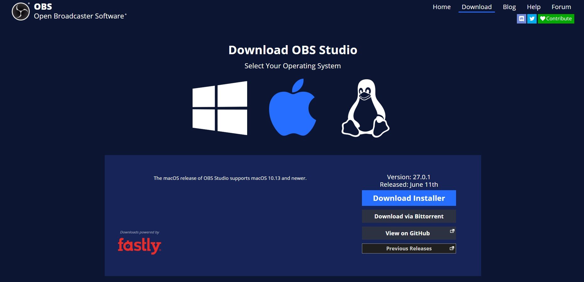 Um zu beginnen,klicken Sie hierum zur offiziellen OBS-Website (Open Broadcaster Software) zu gelangen. WählenMacOSund laden Sie das Installationsprogramm herunter. Das Herunterladen des OBS-Installationsprogramms dauert einige Sekunden und muss auf Ihrem System installiert werden. Nachdem Sie das Installationsprogramm heruntergeladen und installiert haben, können Sie OBS Studio öffnen.