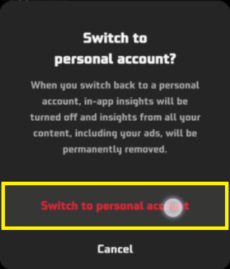Tippen Sie auf diese Option und wählen Sie dann in der folgenden Eingabeaufforderung „Zum persönlichen Konto wechseln“ aus. Instagram benachrichtigt Sie über die Funktionen, die Sie durch den Wechsel verlieren. Wenn Sie sicher sind, fahren Sie fort, indem Sie auf „Zurückschalten“ tippen.