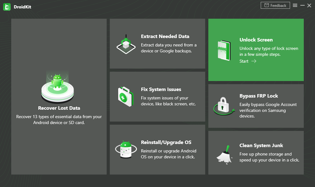 Schritt 1: Laden Sie zunächst die aktualisierte Version von DroidKit auf Ihren Computer herunter. Starten Sie die Software und wählen Sie die Option „Bildschirm entsperren“.