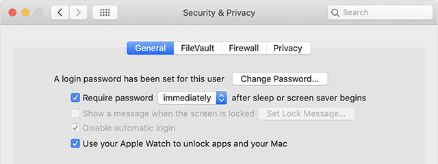 Klicken Sie oben auf dem Bildschirm auf das Apple-Logo > Wählen Sie „Systemeinstellungen“ > Klicken Sie auf „Sicherheit und Datenschutz“Option > Klicken Sie auf „Verwenden Sie Ihre Apple Watch, um Apps und Ihren Mac zu entsperren.“