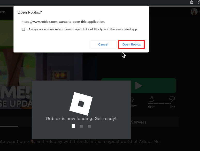 Als Nächstes können Sie ähnliche Schritte ausführen, wenn Sie die Roblox-App auf Ihrem Mac aktualisieren. Navigieren Sie zu Roblox.com und melden Sie sich mit Ihrem Konto an. Beim Starten eines Roblox-Erlebnisses sucht das Spiel nach Updates und lädt die neuesten Updates herunter, bevor es dem Spielserver beitritt.