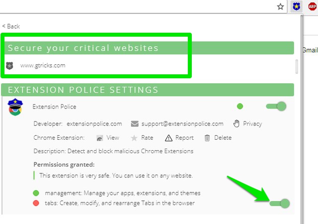 Anhand all dieser Daten können Sie beurteilen, ob der Entwickler vertrauenswürdig genug ist, alle Ihre Daten in seine Hände zu legen. Sie können auch zu den Einstellungen der Erweiterungspolizei gehen"Gang"Schaltfläche in der oberen rechten Ecke. Hier können Sie das aktivieren„Kritische Websites sichern“Funktion, mit der Sie vertrauliche Websites (wie die Website Ihrer Bank) zur Liste der automatischen Deaktivierung hinzufügen können. Und wenn Sie auf diese sensiblen Websites zugreifen, werden alle Erweiterungen automatisch deaktiviert.