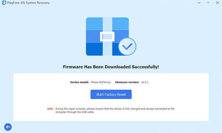 Zuerst können Sie Ihr iPhone über ein USB-Kabel mit Ihrem Computer verbinden und dann MagFone iOS System Recovery auf dem Computer öffnen. Wählen Sie „Gerät zurücksetzen“ und klicken Sie auf die Schaltfläche „Auf Werkseinstellungen zurücksetzen“.