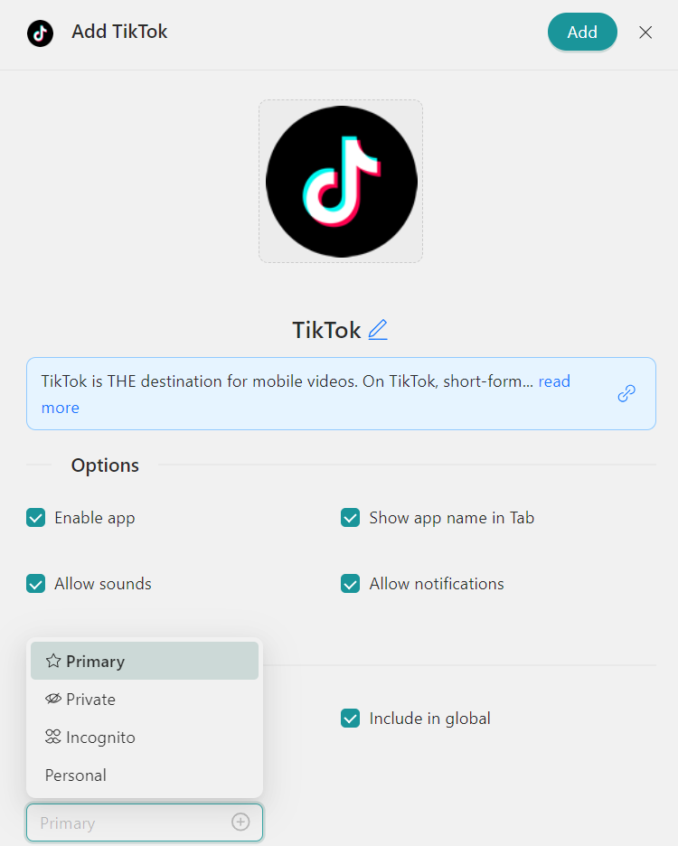 Jedes Profil in Rambox fungiert als dedizierte Sitzung, Bereitstellung einer organisierten Verwaltung beispielsweise fürmehrere TikTok-Konten. Rambox bietet mehrere Schlüsselprofile, die auf unterschiedliche Bedürfnisse zugeschnitten sind: „Primär“ für Standardeinstellungen, „Vom Arbeitsbereich übernehmen“ für verschachtelte Elemente, „Privat“ für isolierte Sitzungen, „Inkognito“ für mehr Privatsphäre ohne Speicherung von Cookies und „Benutzerdefinierte Profile“ für personalisierte Konfigurationen.