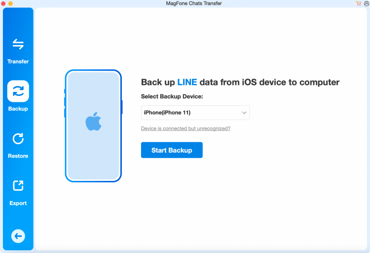 Rufen Sie die Funktionsseite LINE auf und klicken SieSicherungin der linken Leiste. Sobald Ihr iPhone erkannt wurde, klicken Sie aufStarten Sie die Sicherungum Ihren gesamten LINE-Chatverlauf zu sichern.