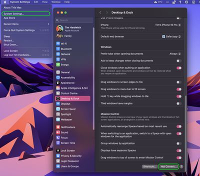 - Klicken Sie aufHeiße Ecken…Schaltfläche unten im Menü.