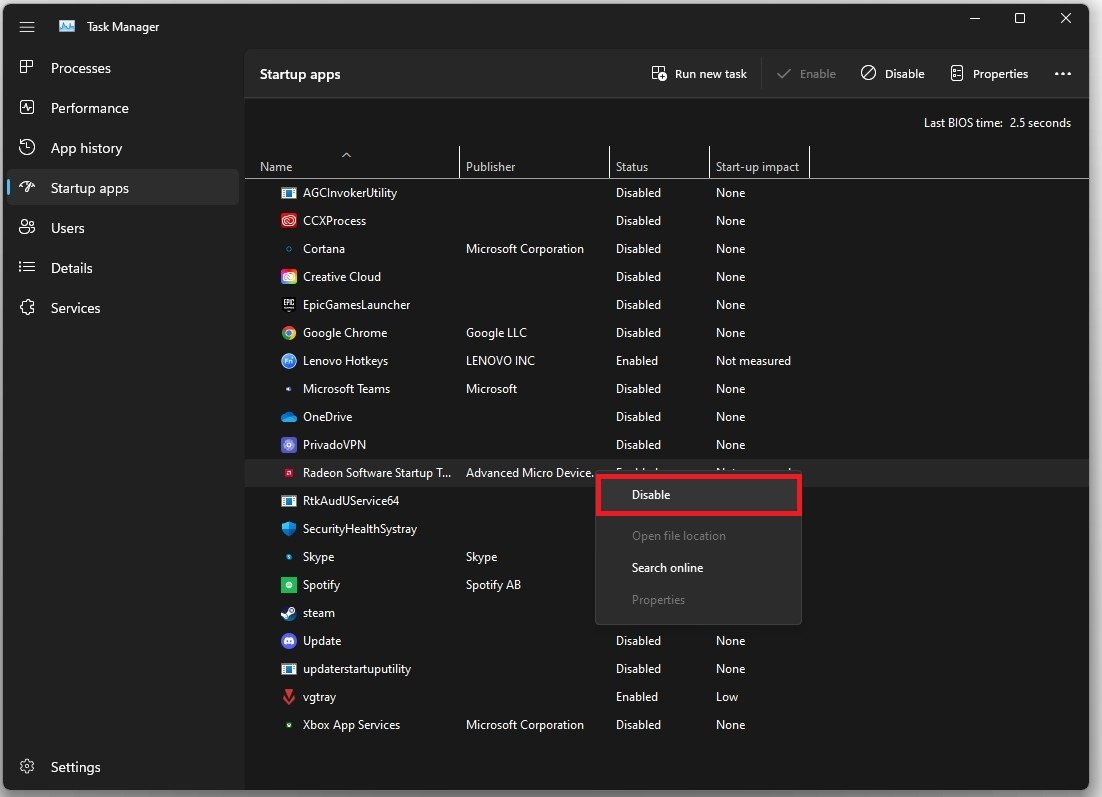 ImStart-upAuf der Registerkarte können Sie verhindern, dass Programme beim Systemstart gestartet werden. Anschließend können Sie Ihre schließenTask-Manager.