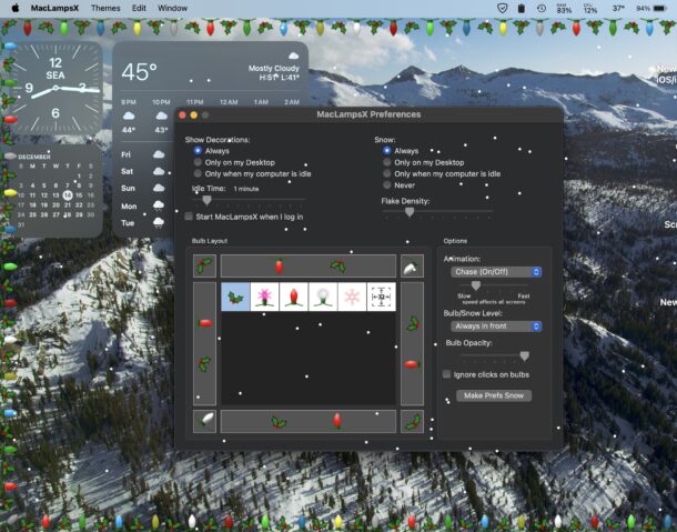 Sie können die Glühbirnen selbst austauschen (und sogar eigene Glühbirnen hinzufügen oder herstellen), die Dichte des fallenden Schnees anpassen, die Glühbirnen und den Schnee über alles oder nur auf dem Schreibtisch erscheinen lassen und vieles mehr. MacLampsX ist eine unterhaltsame kleine App, die an die früheren Tage des klassischen Mac OS erinnert, als es jede Menge unterhaltsame Shareware- und Freeware-Apps für die Macintosh-Plattform gab.