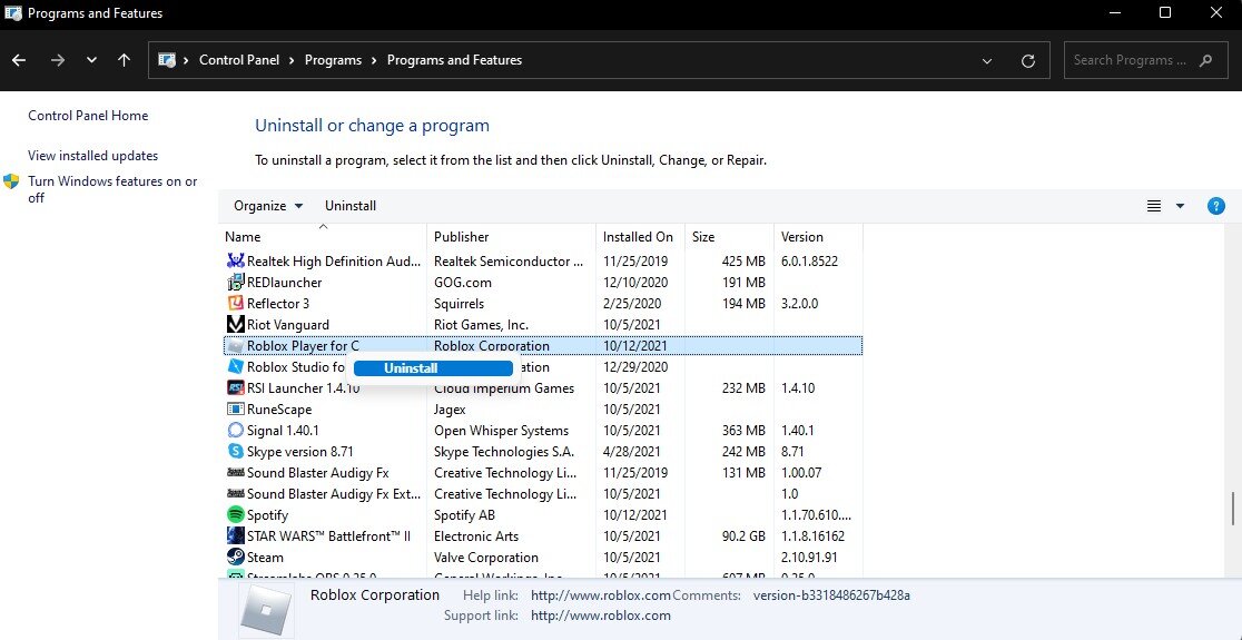 Als letzten Ausweg müssen Sie Roblox neu auf Ihrem System installieren, wenn einige Ihrer Spieldateien fehlen oder beschädigt sind. Öffne deineBedienfeld.Anzeigen nach: Kategorie, und darunterProgramme,wählenDeinstallieren Sie ein Programm. Wählen Sie eine beliebige Anwendung aus und beginnen Sie mit der Eingabe von „Roblox“, um Ihre Roblox Player-Anwendung zu finden. Klicken Sie mit der rechten Maustaste auf die App und wählen Sie sie ausDeinstallieren. Die Deinstallation von Roblox dauert einige Sekunden. Wenn Sie sich das nächste Mal zum Spielen eines Roblox-Spiels entscheiden, werden Sie von Ihrem Browser aufgefordert, das Spiel erneut herunterzuladen und neu zu installierenRoblox-SpielerApp auf Ihr System.