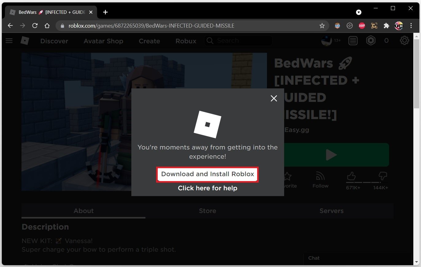 Um die Roblox Player-App neu zu installieren, navigieren Sie zuRoblox.comKlicken Sie in Ihrem Lieblingsbrowser auf „Spiel spielen“. Anschließend werden Sie aufgefordert, die Anwendung erneut herunterzuladen. Die Installation auf Ihrem System dauert eine Minute.