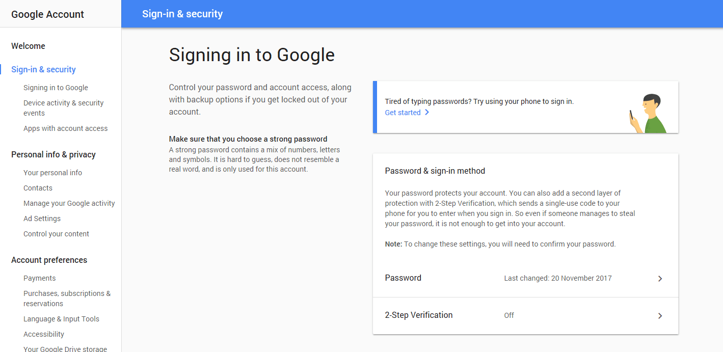 Für Google besuchenaccount.google.comund klicken Sie auf „Anmelden & Sicherheit“, um die Option zum Aktivieren der Bestätigung in zwei Schritten anzuzeigen. Genau wie bei Microsoft handelt es sich um einen schnellen und einfachen Walk-Through-Prozess.