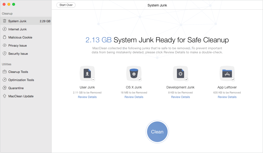 MacClean ist ein benutzerfreundliches OS Und Sie können je nach Bedarf Systemmüll, Internetmüll oder anderen Müll wie bösartige Cookies bereinigen. Um Ihren Mac zu scannen, laden Sie MacClean jetzt herunter.