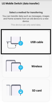 Schritt 2:Führen Sie die LG Mobile Switch-App auf dem Zieltelefon aus und wählen SieUSBVerbindung als Ihre bevorzugte Übertragungsoption. Besorgen Sie sich ein USB-Kabel und verbinden Sie es mit dem OTG-Kabel, um sowohl das Quell- als auch das Zieltelefon miteinander zu verbinden.