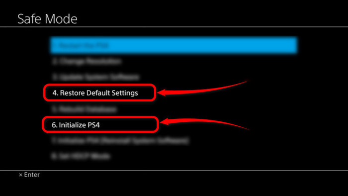 Wenn das Ändern der Auflösung nicht hilft, greifen Sie erneut auf den abgesicherten Modus zu. Dieses Mal wählen SieStandardeinstellungen wiederherstellen. Diese Option setzt die PS4 auf ihre ursprünglichen Einstellungen zurück und reserviert alle Benutzerdaten. Für eine vollständige Löschung wählen Sie jedoch das ausPS4 initialisierenOption.