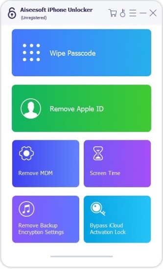 Aiseesoft iPhone Unlockerist ein effizientes Tool zum Entsperren von iPhone, iPad und iPod touch durch Löschen des Passcodes. Wenn Sie Ihr Apple-ID-Passwort vergessen haben, können Sie mit diesem Tool die Apple-ID auf Ihrem iPhone oder iPad entfernen. Außerdem können Bildschirmzeitpasswörter und MDM-Profile ohne Datenverlust vom iPhone und iPad entfernt werden. Wenn Sie die iTunes-Backup-Verschlüsselungseinstellungen von Ihrem iPhone löschen möchten, kann Aiseesoft iPhone Unlocker ein guter Helfer sein.