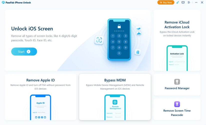 | Merkmale | Entsperren Sie verschiedene Bildschirmsperren wie Face ID und Touch ID Umgehen Sie die MDM-Sperre und die iCloud-Aktivierungssperre Entfernen Sie den Apple-ID- und Bildschirmzeit-Passcode ohne Datenverlust Verwalten und exportieren Sie auf iOS-Geräten gespeicherte Passwörter |