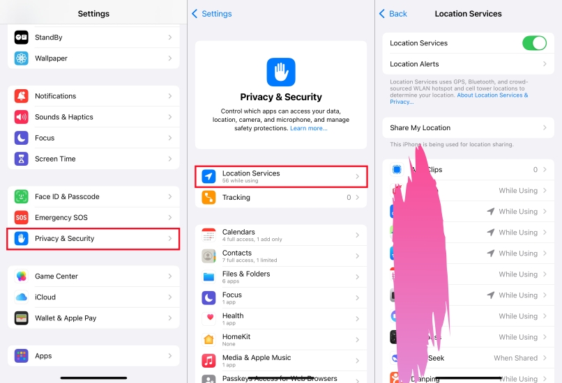 Schritt 1.OffenEinstellungen > Datenschutz und Sicherheit > Ortungsdienste.