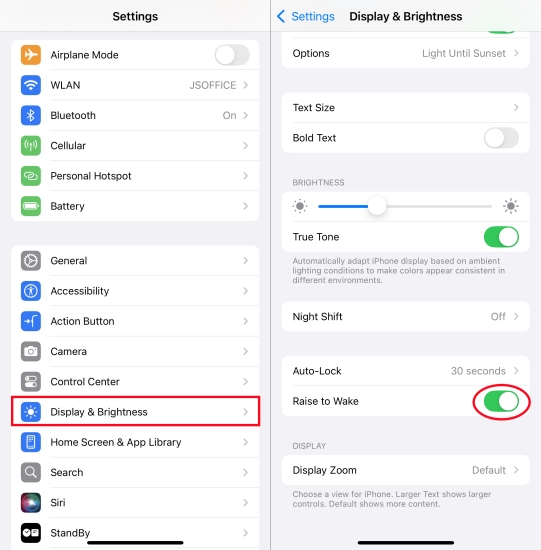Erhebe dich, um aufzuwachen:Gehen Sie zu „Einstellungen“ > „Anzeige & Helligkeit“ und deaktivieren Sie „Raise to Wake“.