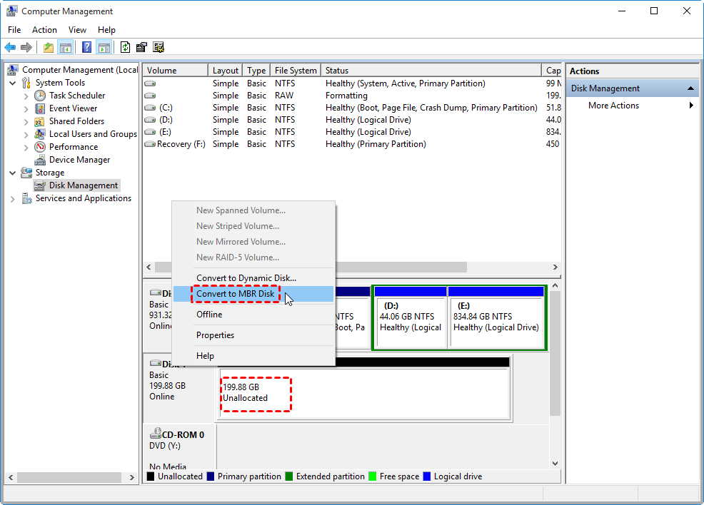 Schritt 3.Sobald alle Partitionen gelöscht sind, klicken Sie mit der rechten Maustaste auf die Festplatte und wählen Sie „Auf MBR-Festplatte konvertieren”-Option.