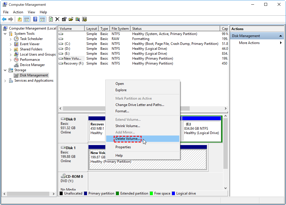 Schritt 1.Nachdem Sie alle Daten auf der Zielfestplatte gesichert haben, klicken Sie bitte mit der rechten Maustaste nacheinander auf die Partitionen, um alle Partitionen auf der Festplatte zu löschen.