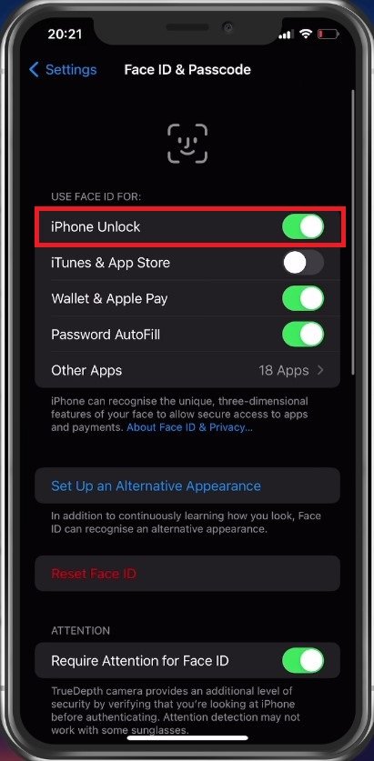 Stellen Sie nach der Eingabe Ihres Passcodes sicher, dass Sie das umschalteniPhone entsperrenOption aus- und wieder einschalten.