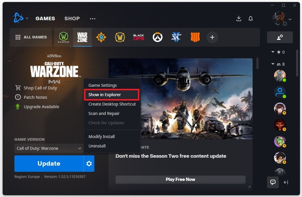 Öffne deineBlizzard-Launcherund klicken Sie auf das Zahnradsymbol neben der Wiedergabeschaltfläche für Warzone. WählenIm Explorer anzeigen.