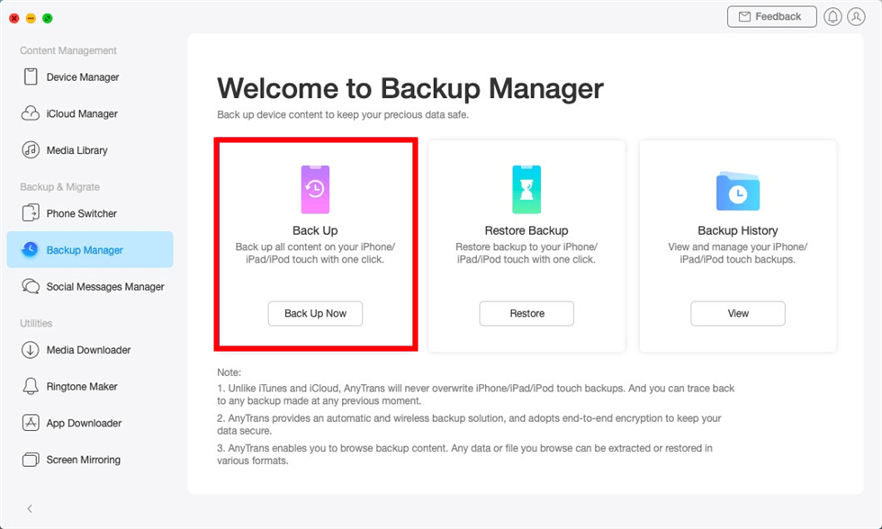 Da es nicht einfach ist, zu überprüfen, was Sie in iCloud gespeichert haben, empfehlen wir Ihnen dringend, die Daten zu schützen, indem Sie sie mit einem professionellen Datenverwaltungstool direkt auf Ihrem Computer sichern. AnyTrans – iPhone Data Manager ist ein solches Tool, das erstaunliche Funktionen für die Verwaltung, Übertragung und Sicherung von iOS-Daten bietet.