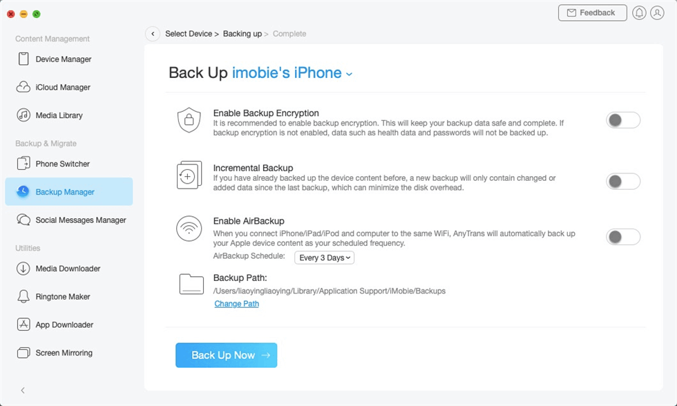 Es bietet mehrere Backup-Optionen, darunter vollständige, inkrementelle und drahtlose Backups, sodass Sie ganz einfach sicherstellen können, dass Ihre Daten immer sicher und geschützt sind. Mit nur wenigen Klicks erleichtert AnyTrans die Sicherung Ihrer Gerätedaten und gibt Ihnen die Gewissheit, dass Ihre Daten geschützt sind, sodass Sie sich keine Sorgen machen müssen, sie in Zukunft erneut zu verlieren. Weitere Informationen zu den wichtigsten Funktionen finden Sie weiter unten.