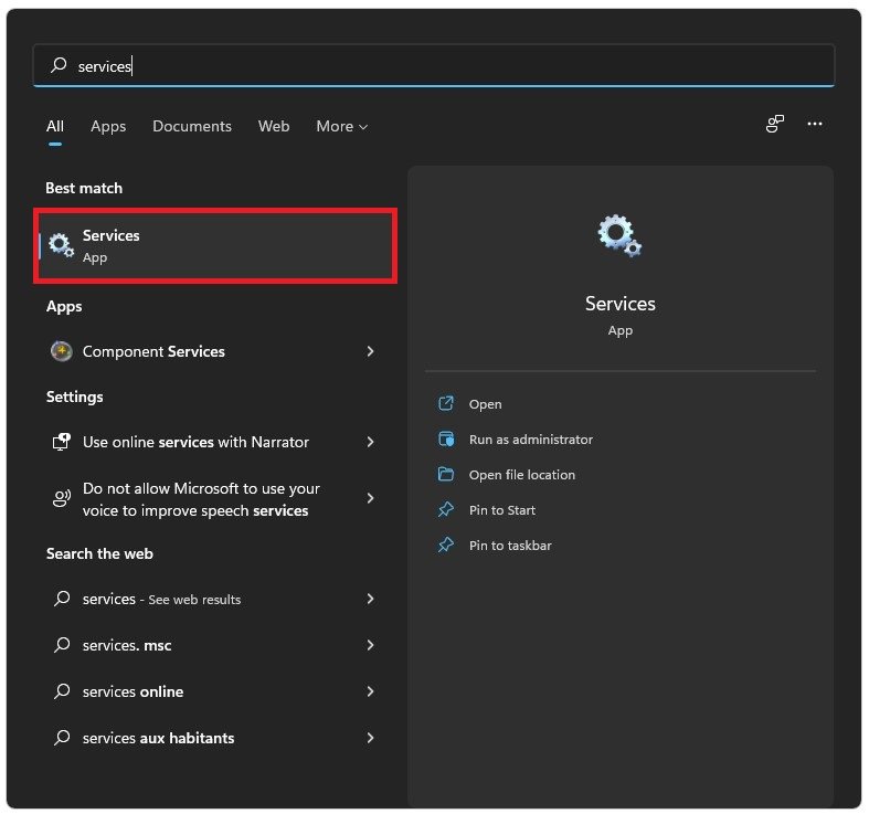 Öffne deineWindows-Dienste-Managerdurch die Suche nachDienstleistungenin Ihrer Startmenü-Suche.