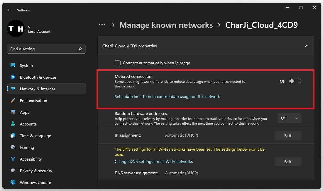 Klicken Sie auf die WLAN-Verbindung, die auf Ihrem System nicht funktioniert, und stellen Sie sicher, dass dieGemessene VerbindungOption ist deaktiviert.