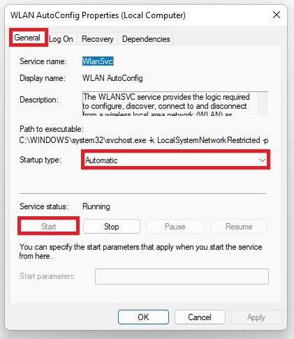 WLAN AutoConfig Properties > General > Services Status