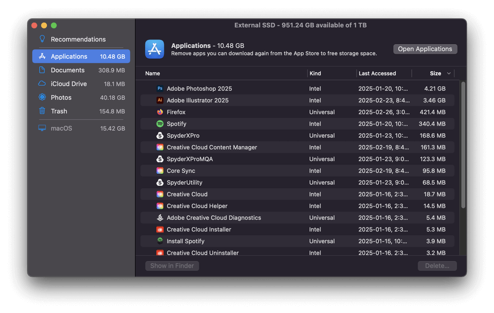 En haut de la liste, cliquez sur leDernier accèsen-tête de colonne pour trier la liste par date d'utilisation (cliquez à nouveau dessus pour changer l'ordre de tri). Cela vous aidera à identifier quelles applications ne sont plus utilisées, même si vous les avez oubliées ! Sélectionnez un élément dans la liste et cliquez surSupprimerpour le désinstaller de votre Mac.