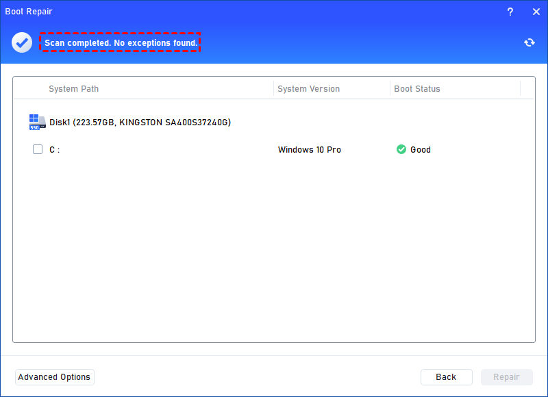 Étape 3. Une fois le processus terminé, le résultat de l'analyse s'affichera : chemins d'accès au système, versions du système et état de démarrage. Et toutes les entrées de démarrage réparables pourront être sélectionnées.
