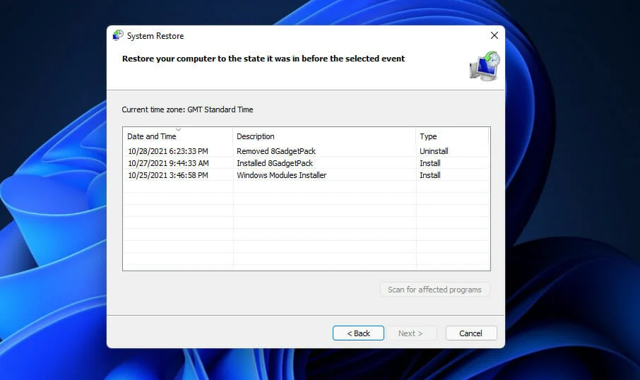 Correctif 10. Remettez Windows 11 à un point de restauration