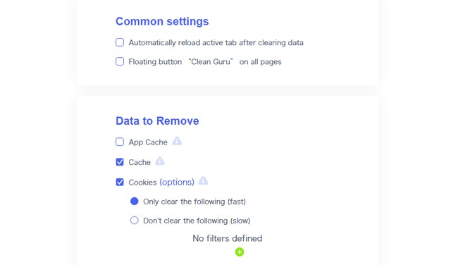 Vous pouvez cliquer sur l'icône d'engrenage pour ouvrir la page des paramètres et y sélectionner le type de données qui serait supprimé. Clean All vous permet de supprimer autant de données que l'extension ci-dessus, mais va encore plus loin en vous permettant de mettre en liste blanche des cookies spécifiques pour garantir que les cookies importants ne sont pas supprimés.