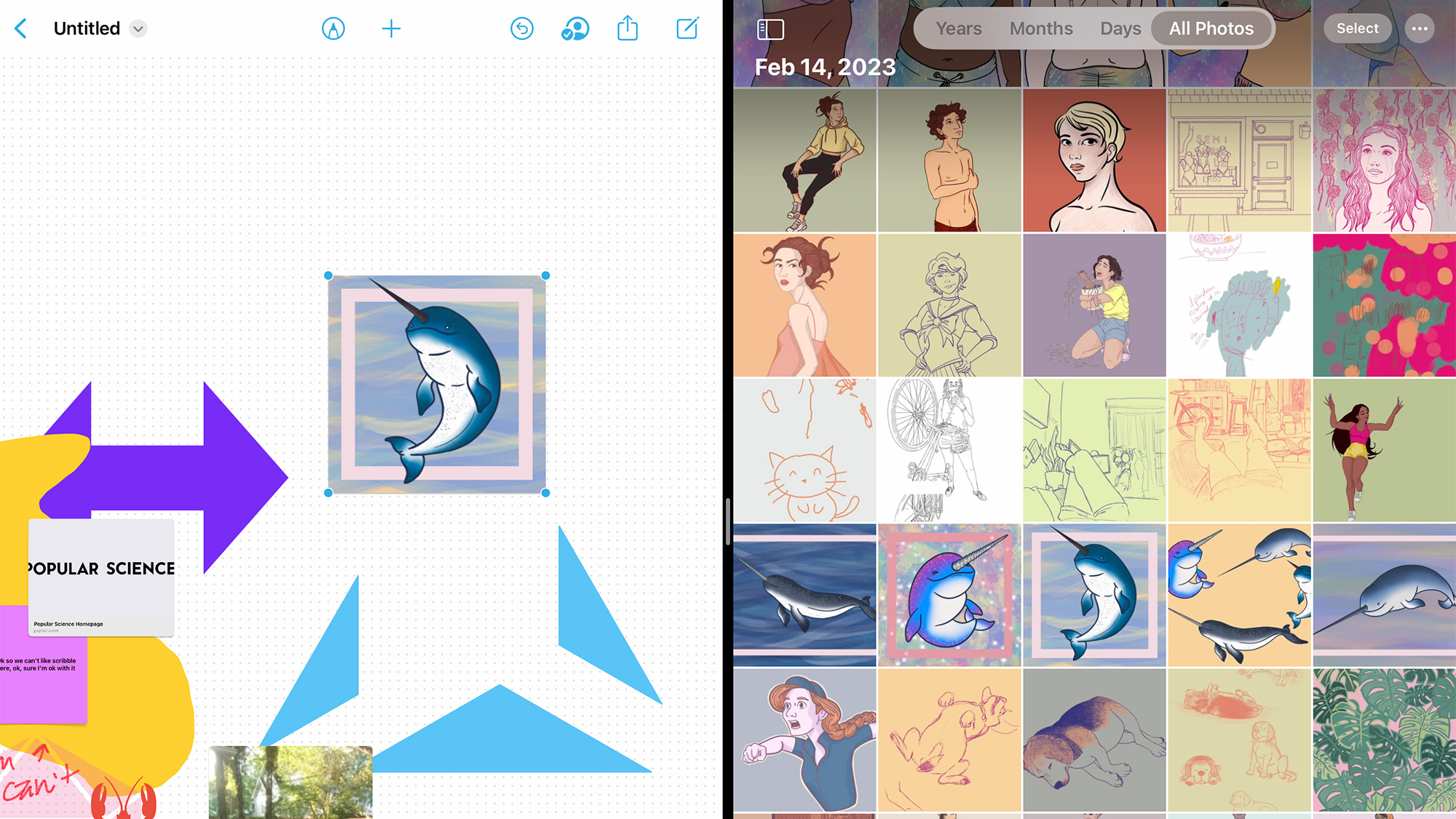 Split View est particulièrement pratique si vous devez insérer de nombreuses images dans votre toile. Sandra GutiérrezApple a introduit Split View pour iPadOS en 2015 et, quatre ans plus tard, a étendu sa prise en charge à macOS. La fonctionnalité vous permet d’utiliser deux applications à la fois, et si les deux sont natives de l’écosystème de l’entreprise, vous pouvez facilement faire glisser des éléments de l’une à l’autre.