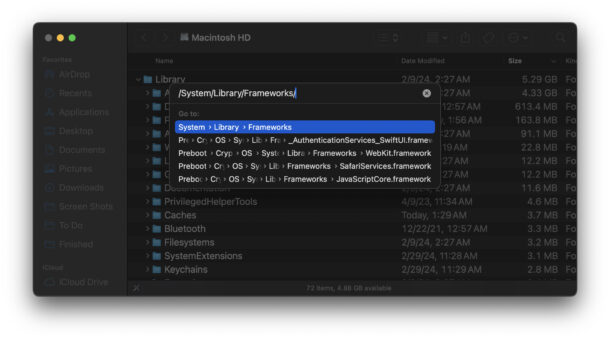 Dans le Finder, appuyez sur Commande+Maj+G pour afficher Aller au dossier.