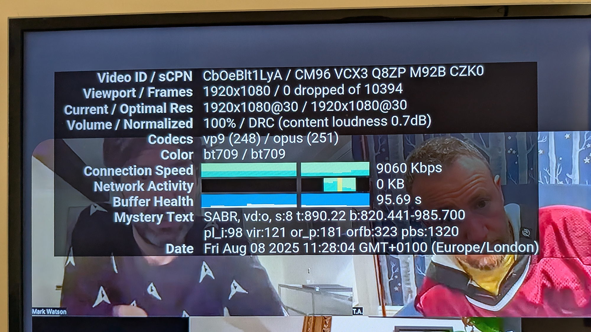 Si vous souhaitez voir les performances de YouTube sur votre téléviseur, y compris la résolution vidéo et les vitesses du réseau, appuyez sur Sélectionner sur une vidéo, faites défiler vers la droite pour sélectionner l'icône d'engrenage, puis activezStatistiques pour les nerds. Le panneau est également utile pour résoudre les problèmes liés à l'application.