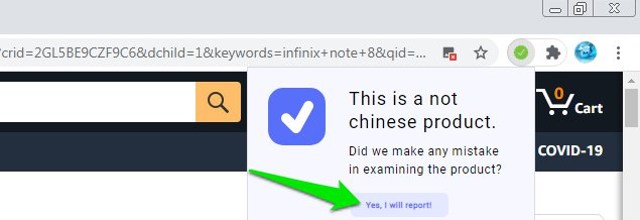 L'extension n'est certainement pas parfaite, mais vous pouvez également contribuer à améliorer encore sa précision en signalant les produits qui sont chinois mais qui ne sont pas répertoriés comme tel par l'extension. Tout ce que vous avez à faire est de cliquer sur l'extension et de cliquer sur le"Oui, je ferai rapport"bouton pour envoyer immédiatement le rapport (pas besoin d’écrire quoi que ce soit).