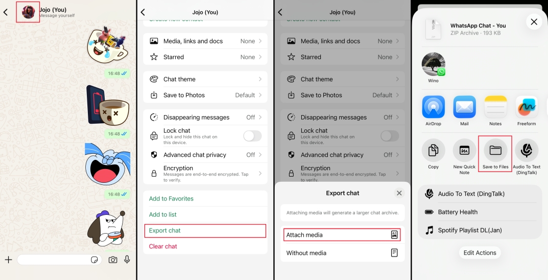 Étape 2.Appuyez sur l'icône de profil et faites défiler vers le bas. RobinetExporter le chatet choisissezJoindre un médiapour exporter le chat avec des autocollants.
